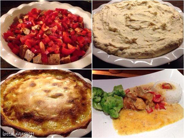 Gör en marinad och häll i en påse. Jag använder mig av denna marinad. Lägg kycklingfiléerna i påsen och låt vila en stund. Häll sedan över filéerna och marinaden i en ugnssäker form och krydda lite med cayennepeppar. Grädda i mitten av ugnen 225 C i 30 minuter. Skär sedan kycklingen och paprikan i bitar. Lägg kycklingen i botten på en ugnsform och paprikan över.