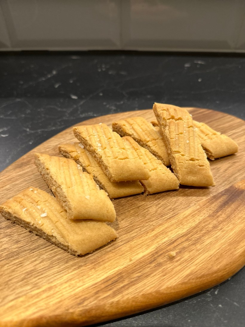Ställ ugnen på 175 grader. Rör ihop det rumsvarma smöret och sockret. Blanda mjöl, bakpulver , vaniljsocker, och salt i en skål. Rör sedan ner alltsammans i smörblandningen. Till sist rör du ner sirapen. Knåda till en deg. Dela degen i 3 delar. Och rulla ut dem till längder. Platta meden gaffel på ytan för att platta till längderna. Strö på lite flingsalt. Grädda sedan i mitten på ugnen i ca 8-10 minuter. Låt svalna något innan du skär dem i snitt.