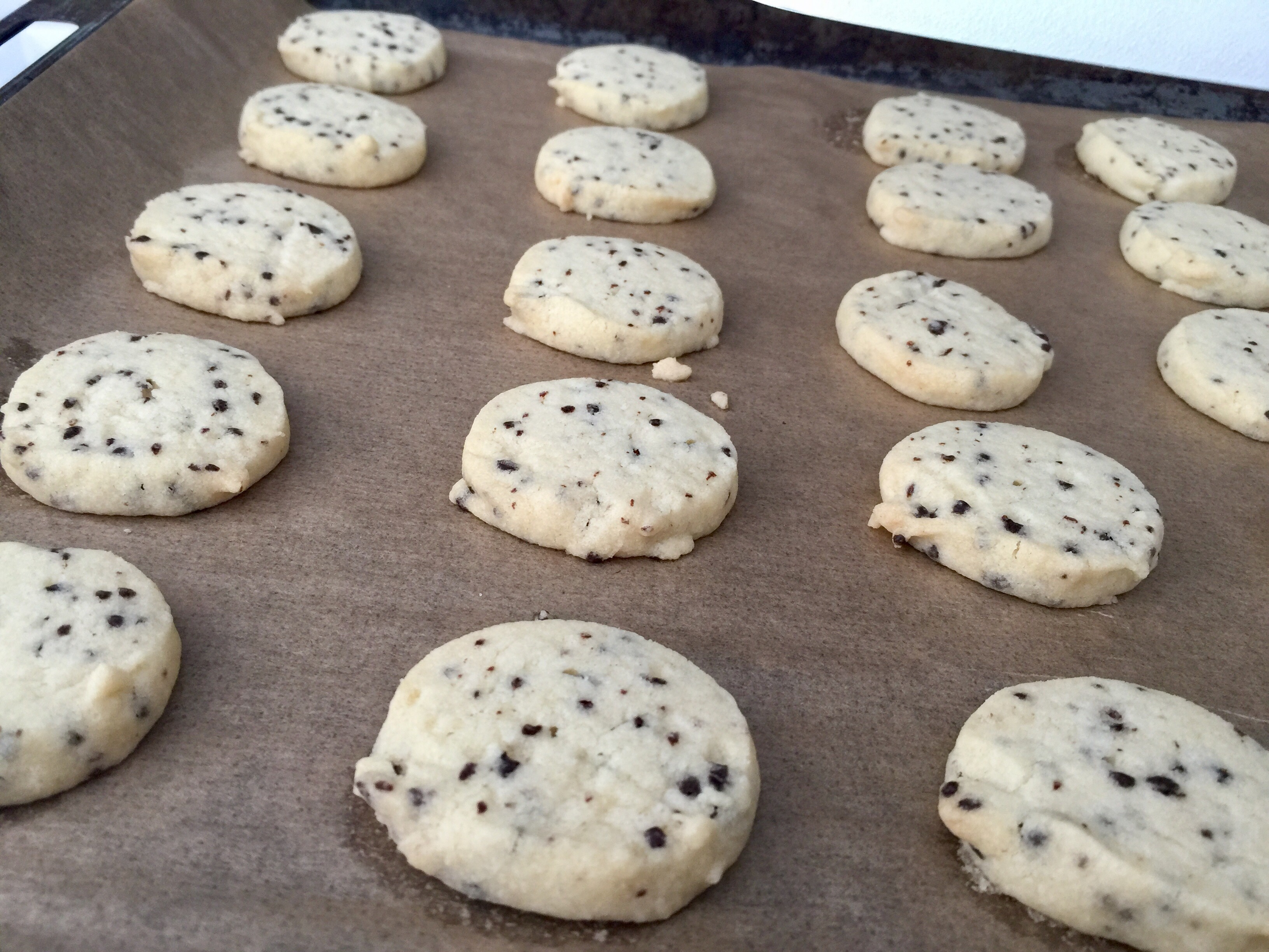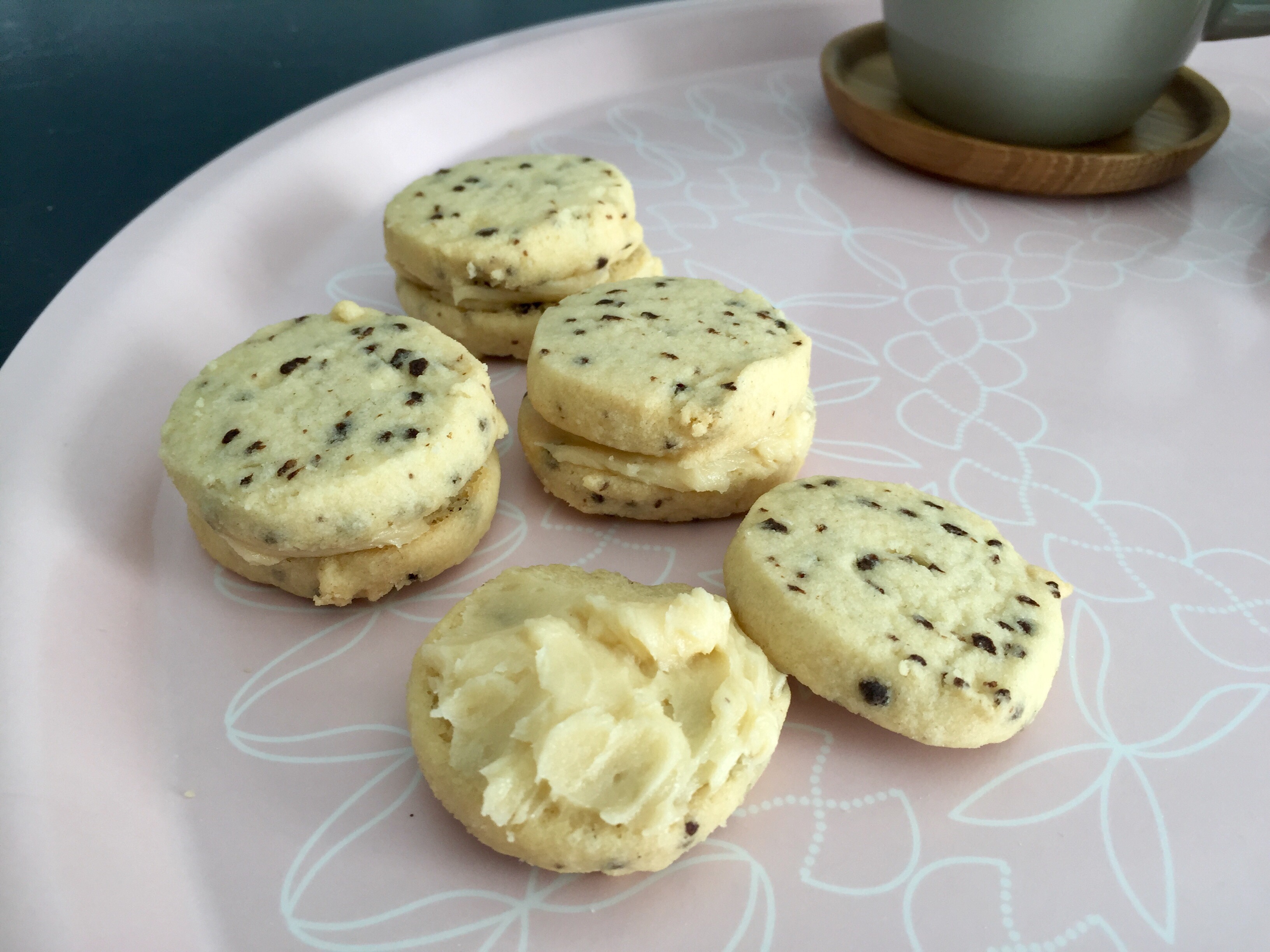 VIspa smör och socker fluffigt. Blanda de torra ingredienserna och rör ner dem. Forma degen till två rullar 4-5 cm i diameter. Plasta in rullarna och lägg dem i kylen i ca 2 timmar. Sätt ugnen på 175 grader. Skär i ca 0,5 cm tjocka skivor och lägg på en plåt med bakplåtspapper. Grädda i ca 8 minuter. Kakorna flyter ut lite så lägg dem inte för tätt. Låt kakorna kallna. Gör under tiden smörkrämen. Vispa ihop smör, florsocker och vaniljsocker. Vispa i äggulan och kaffet. Bred smörkrämen på hälften av kakorna och lägg ihop dem två och två.