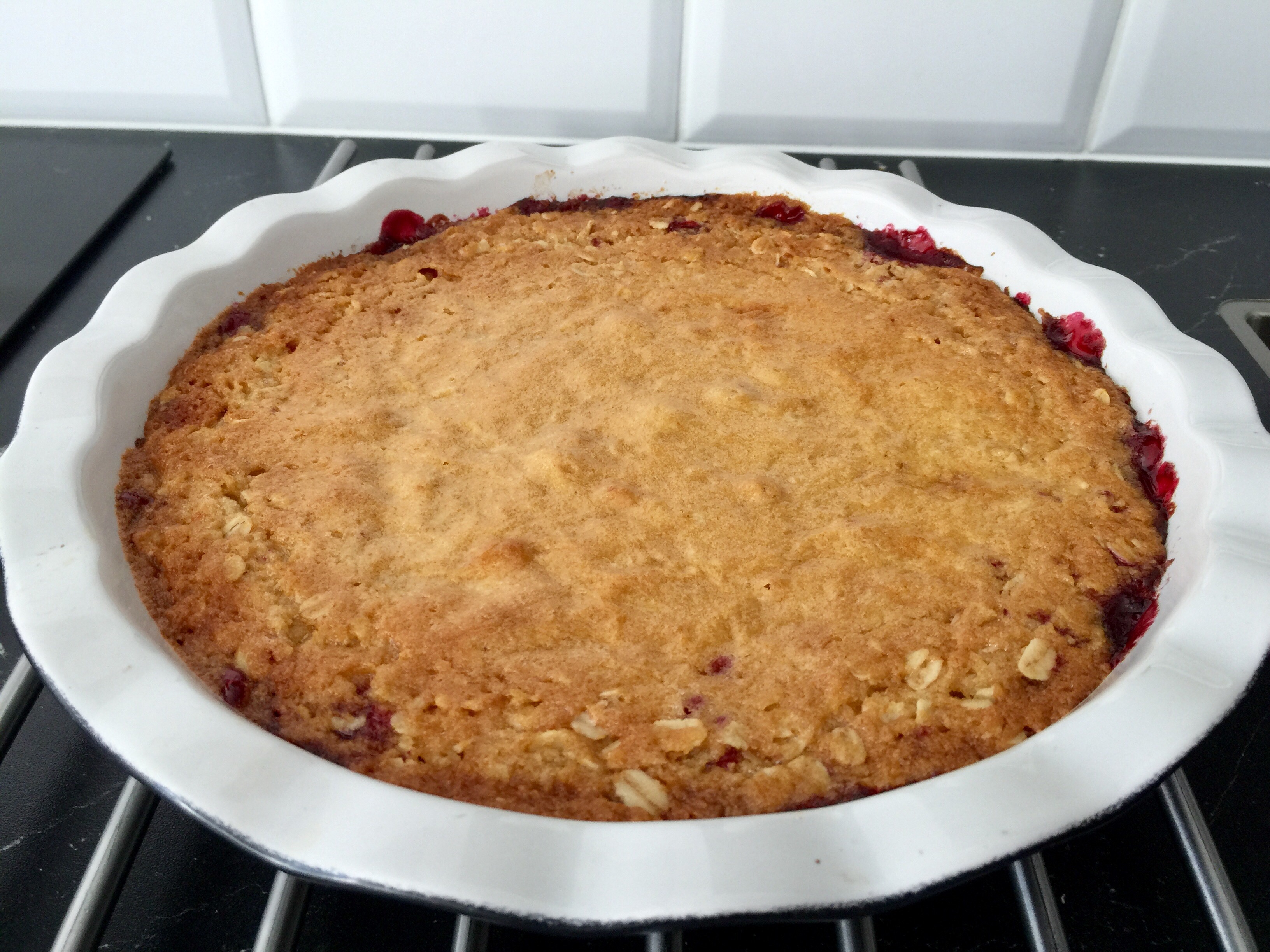 2. Smält sedan margarinet och rör samman alla övriga ingredienser. Häll sedan smeten ovanpå bären.