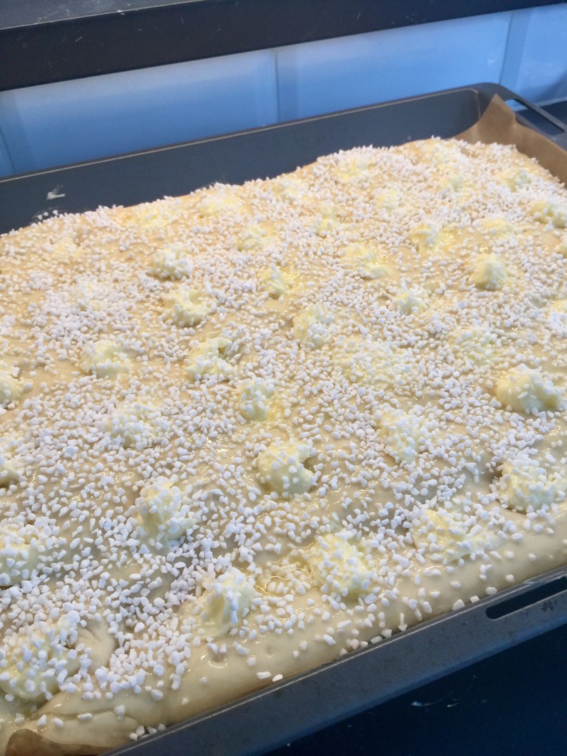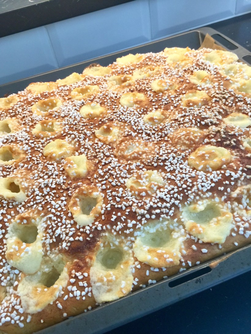 Värm mjölken till 37 C och rör ut jästen med. Tillsätt det rumsvarma smöret, sockret, saltet och nästan allt mjöl. Arbeta degen smidig, gärna i maskin. Använd en ugnplåt täckt med bakplåtpapper. Häll ner degen på plåten och tryck ut den i kanterna (degen blir bra kladdig och lös, men den ska vara så!).Täck med en bakduk och låt jäsa 30 minuter. Rör under tiden ihop ingredienserna till fyllningen.