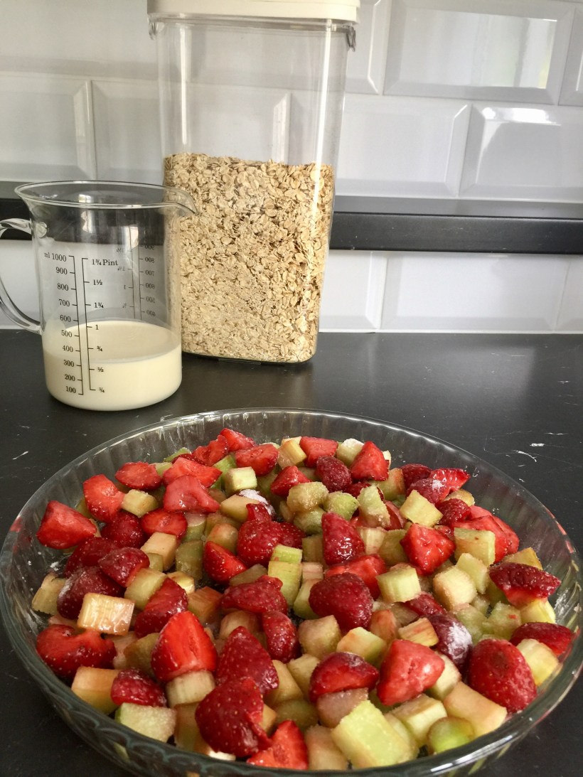 Sätt ugnen på 200 grader, skär rabarbern i mindre bitar, dela jordgubbarna i bitar och lägg allt i en pajform. Blanda socker och potatismjöl och strö över i formen och rör om lite. Blanda mjöl, havregryn, socker och kardemumma i en ny skål. Riv mandelmassan grovt, finfördela mandelmassan och smöret i mjölblandningen till en smulig massa som en smulpaj.