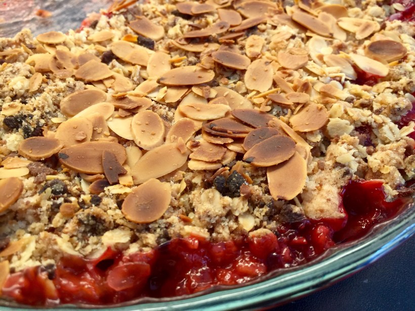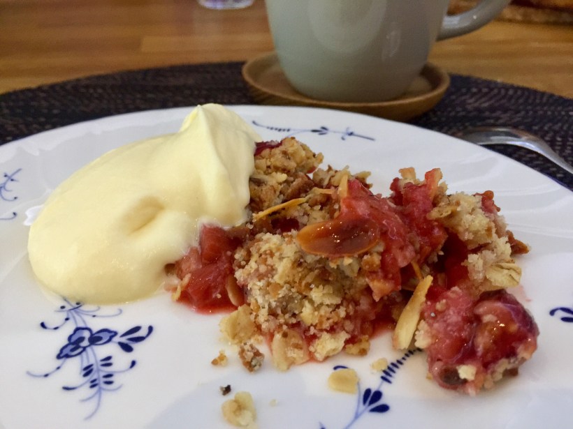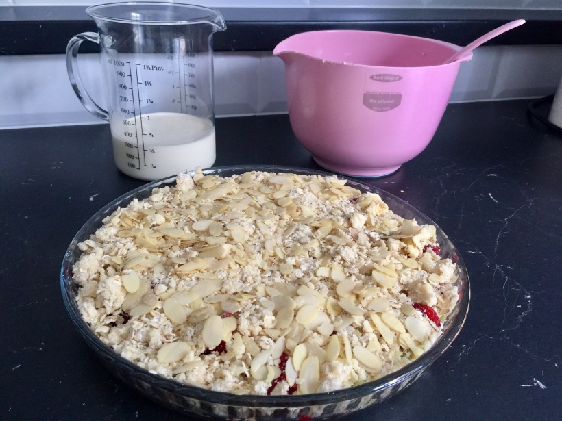 Strö över smuldegen över rabarbern och jordgubbarna, strö sist på mandelspån och gratinera pajen i mitten av ugnen i 25 minuter. Akta så det inte bränns sista 5 minuterna.