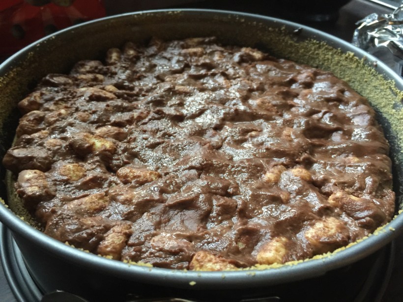 Ta bort från plattan och låt svalna något innan du snabbt vänder ner puffarna och breder pufflagret över kladdkakan. Låt svalna en kvart i kylskåp.