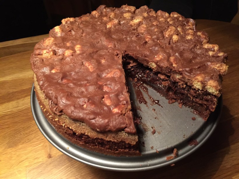 Kladdkaka med krispig tryffeltopping med puffar av ”sea salt”