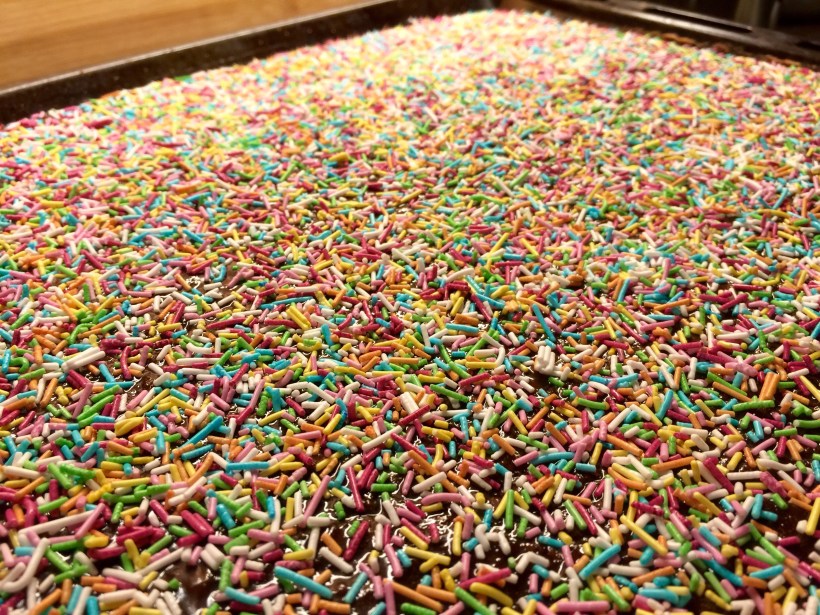 Strö över kokos eller strössel och skär kakan i bitar.