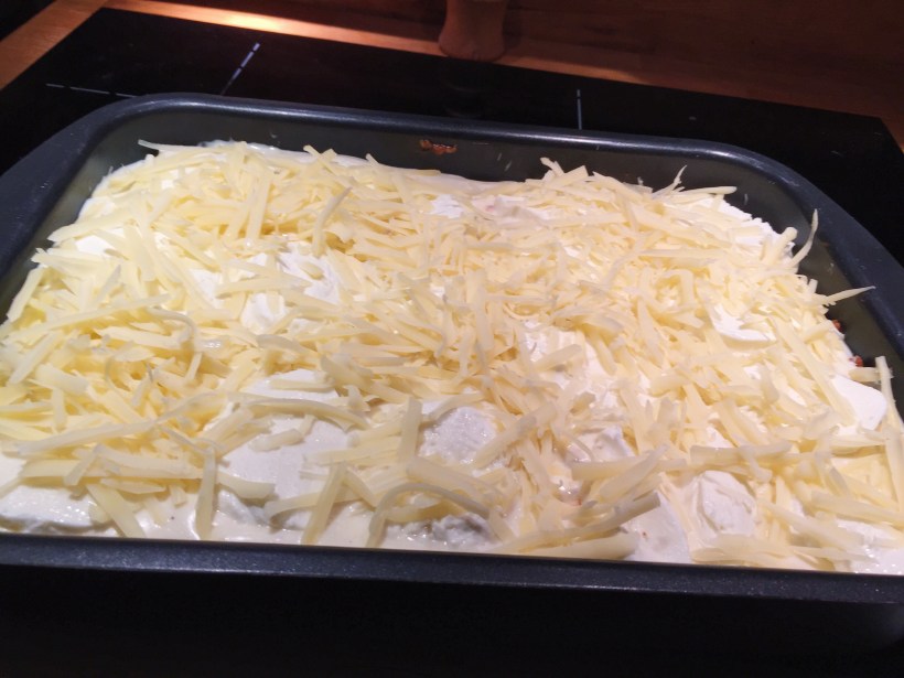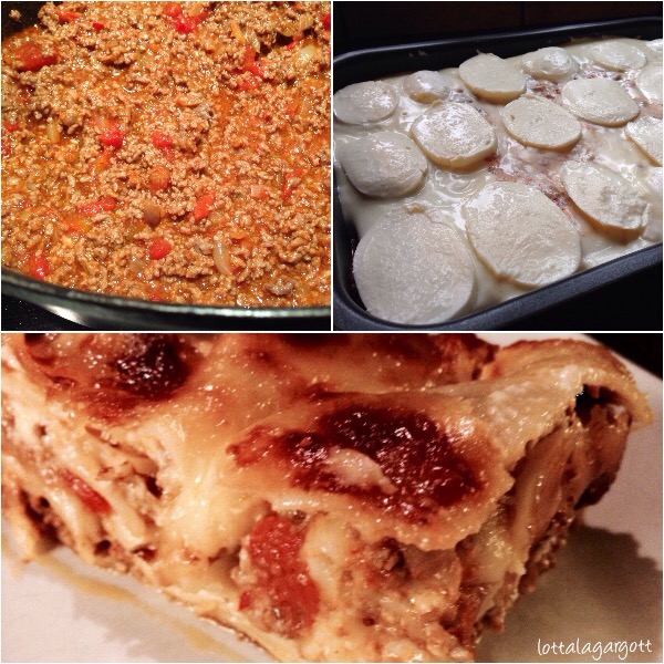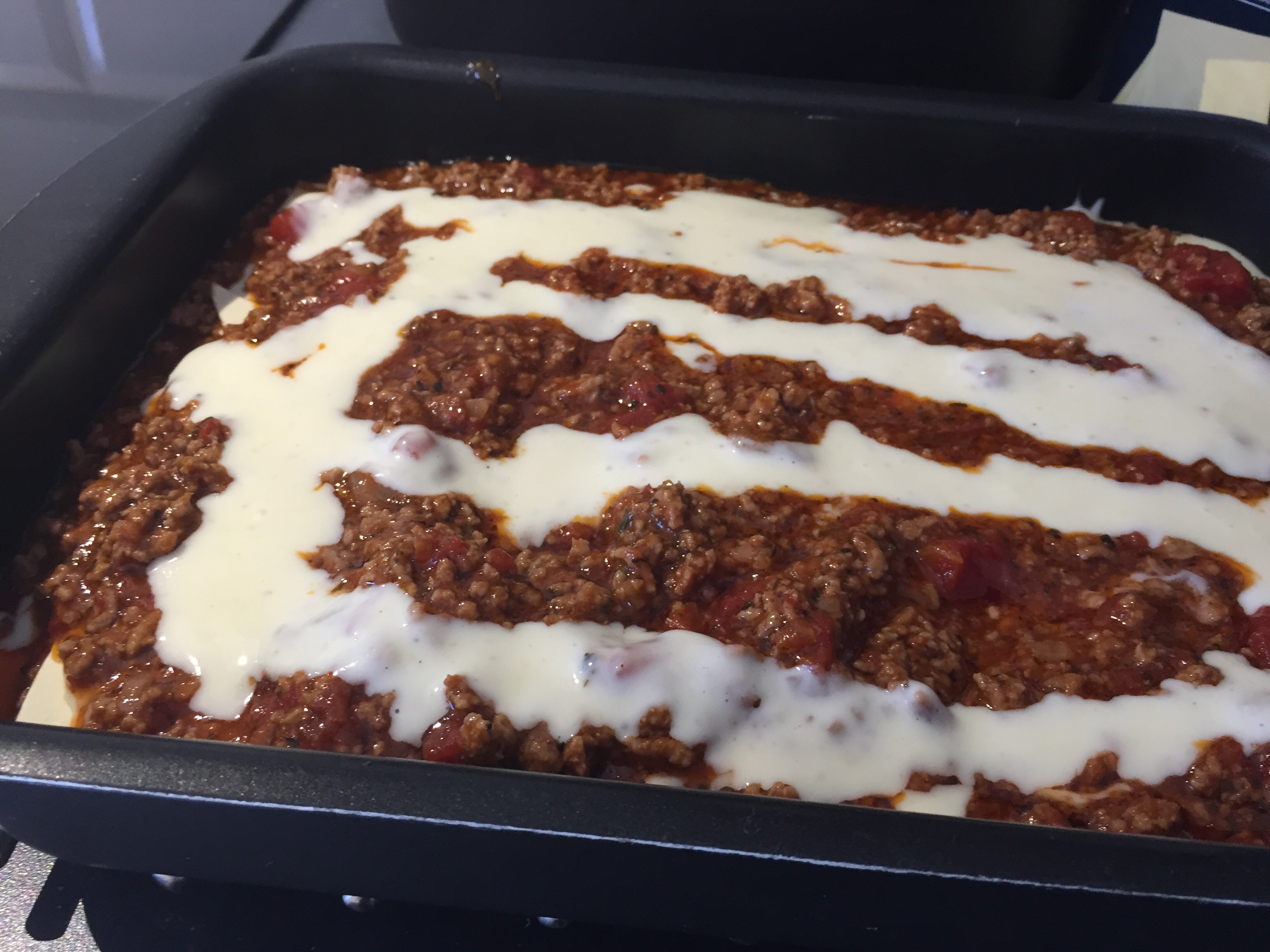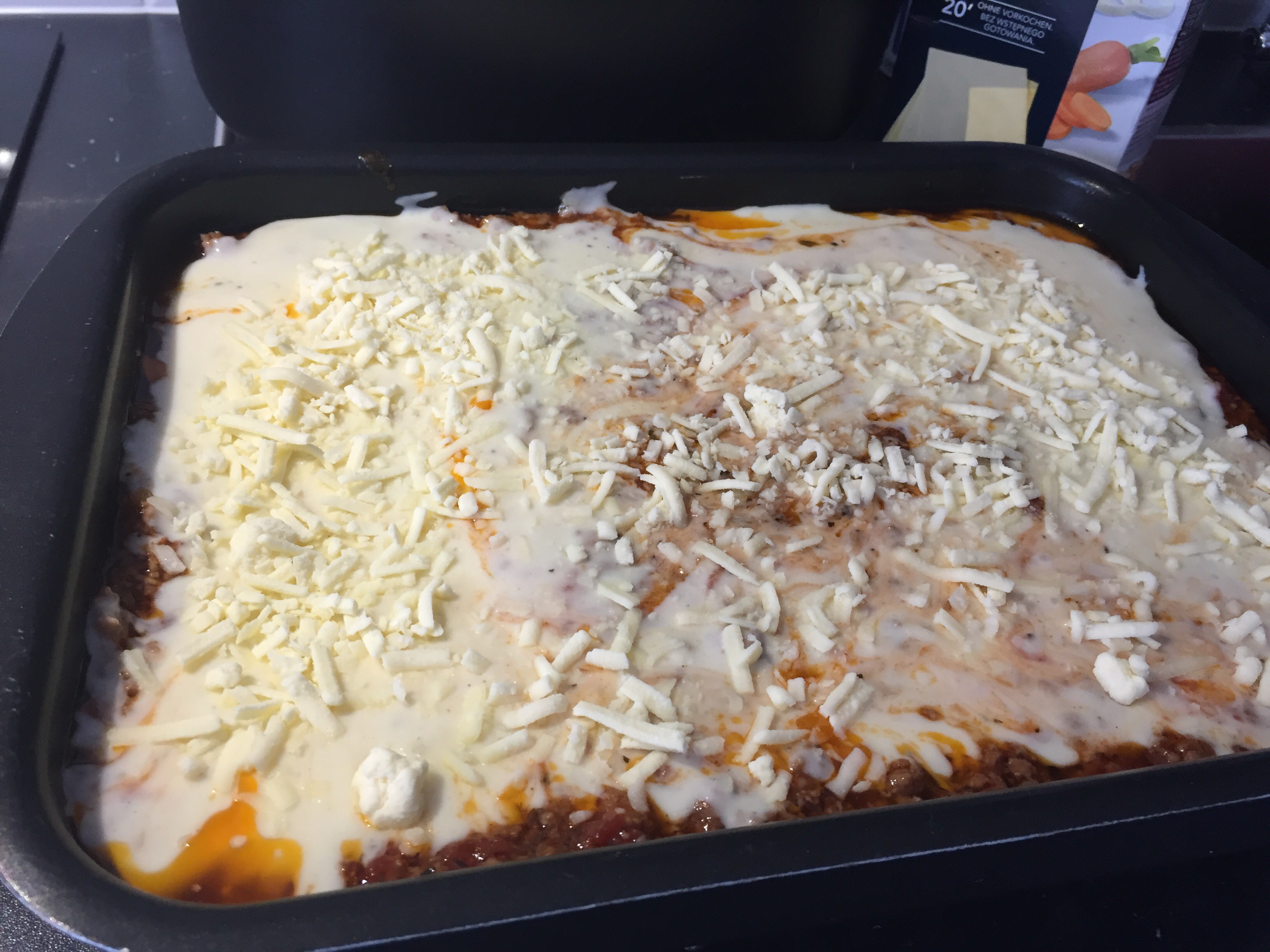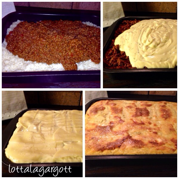 Varva sedan lasagneplattor + köttfärssås + bechamellsås i en ugnsform. Börja med bechamellsås och köttfärs och avsluta med ett lager plattor med bara bechamellsås över (ingen köttfärssås där) och strö över riven ost.