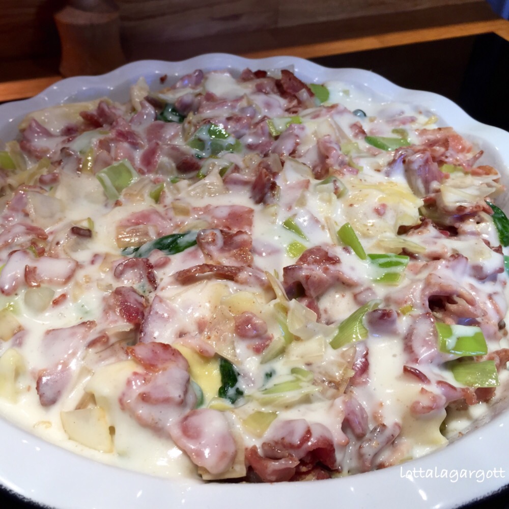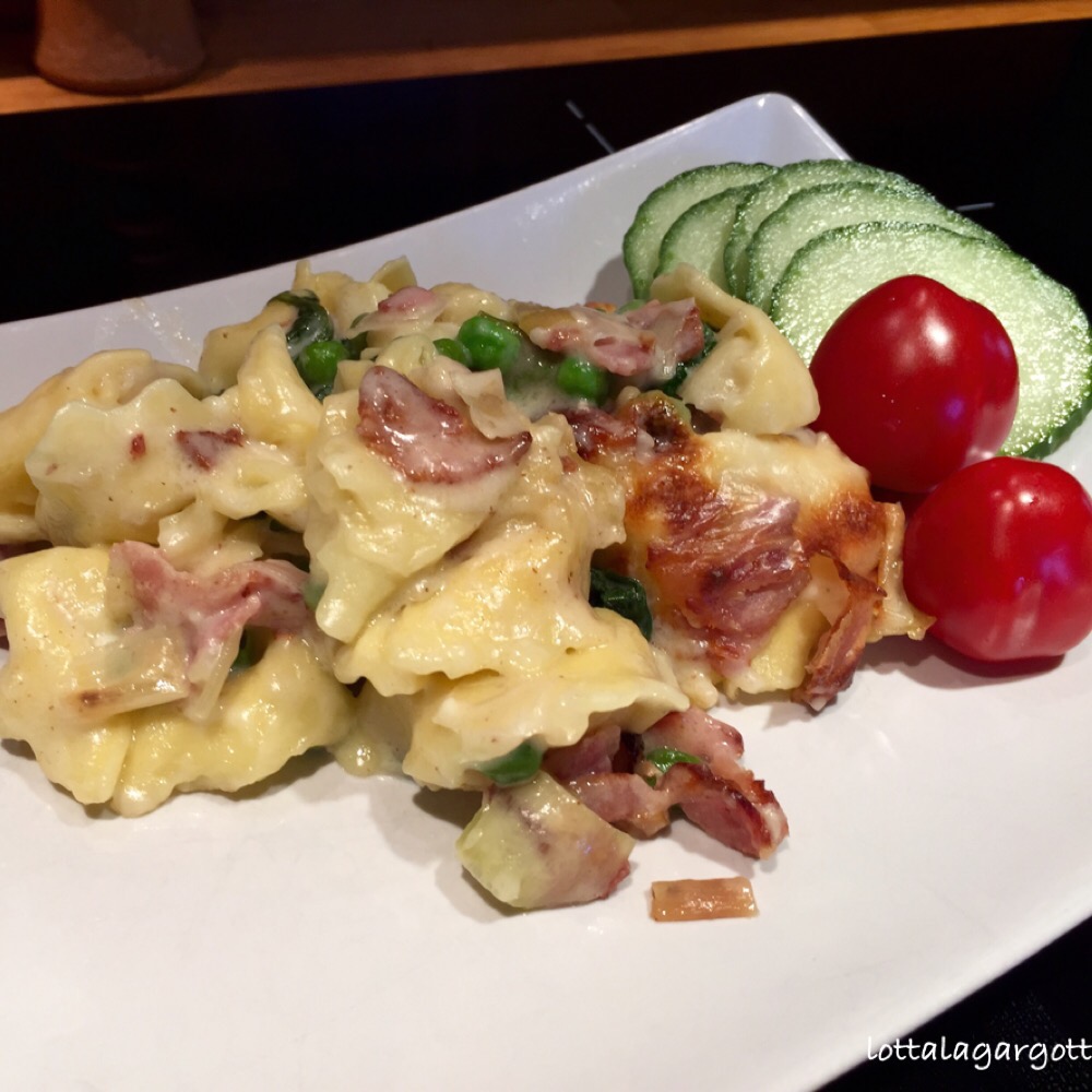 In i ugnen, 225 C i ca 30-45 min (känn så plattorna blivit mjuka, tiden varierar lite på olika märken tycker jag). Låt stå och dra till sig en stund under folie och servera sedan med en god sallad.