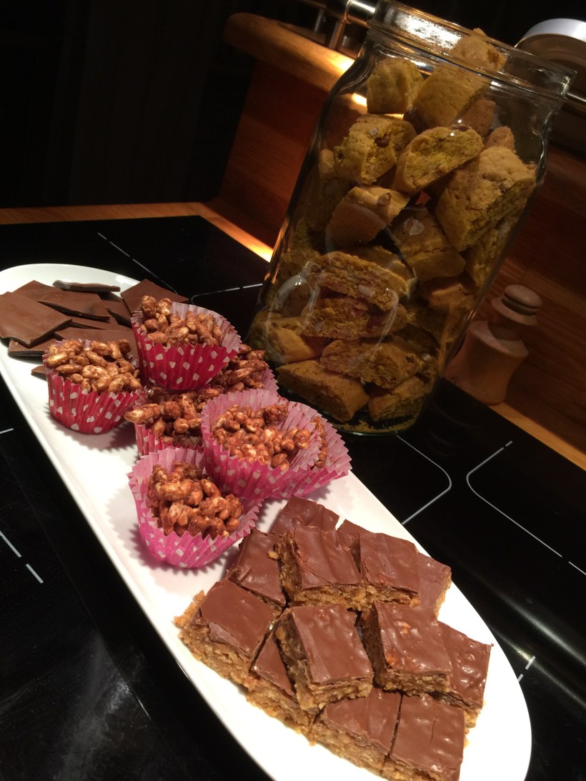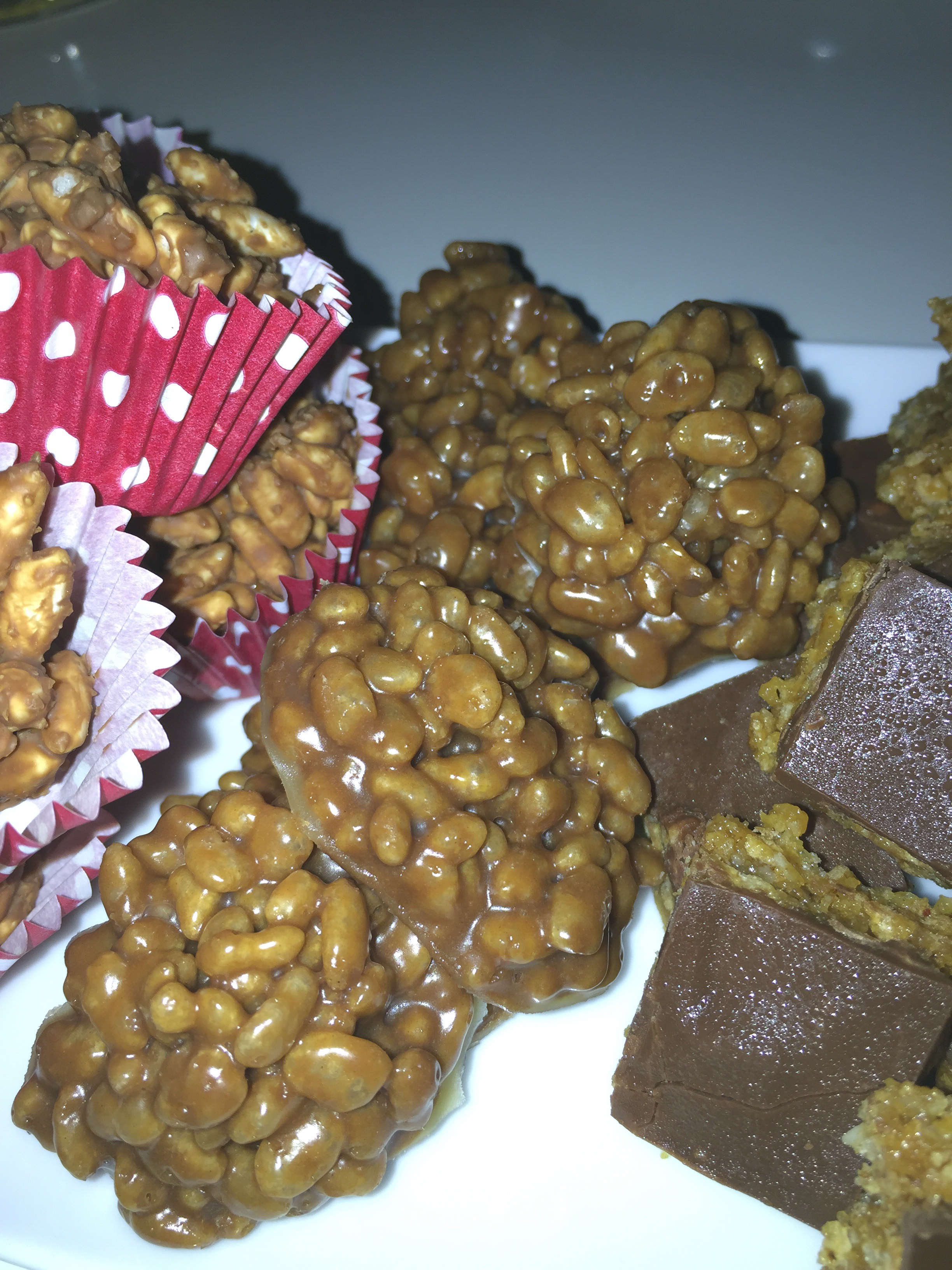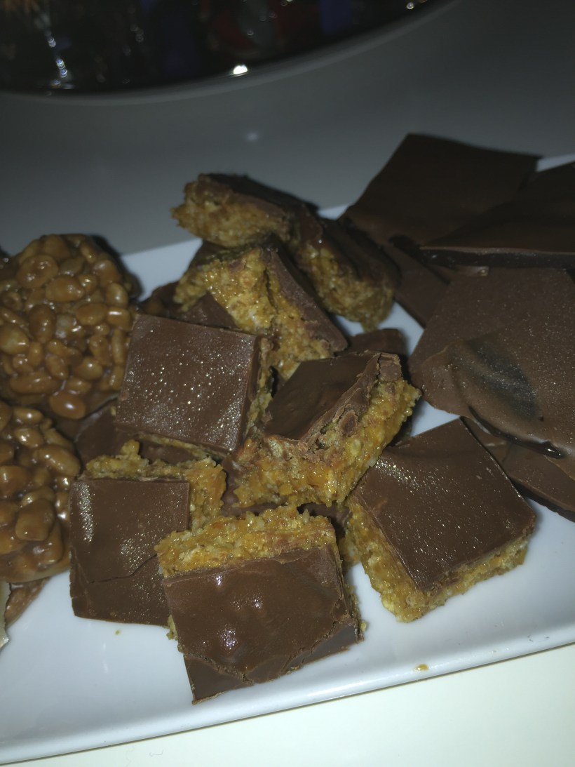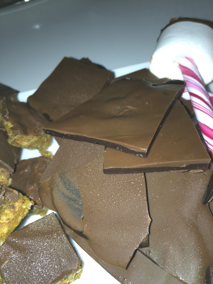Rör om och platta ut i en form ca 30 x 40 cm. Häll över smält blockchoklad. Ställ kallt och skär i bitar.