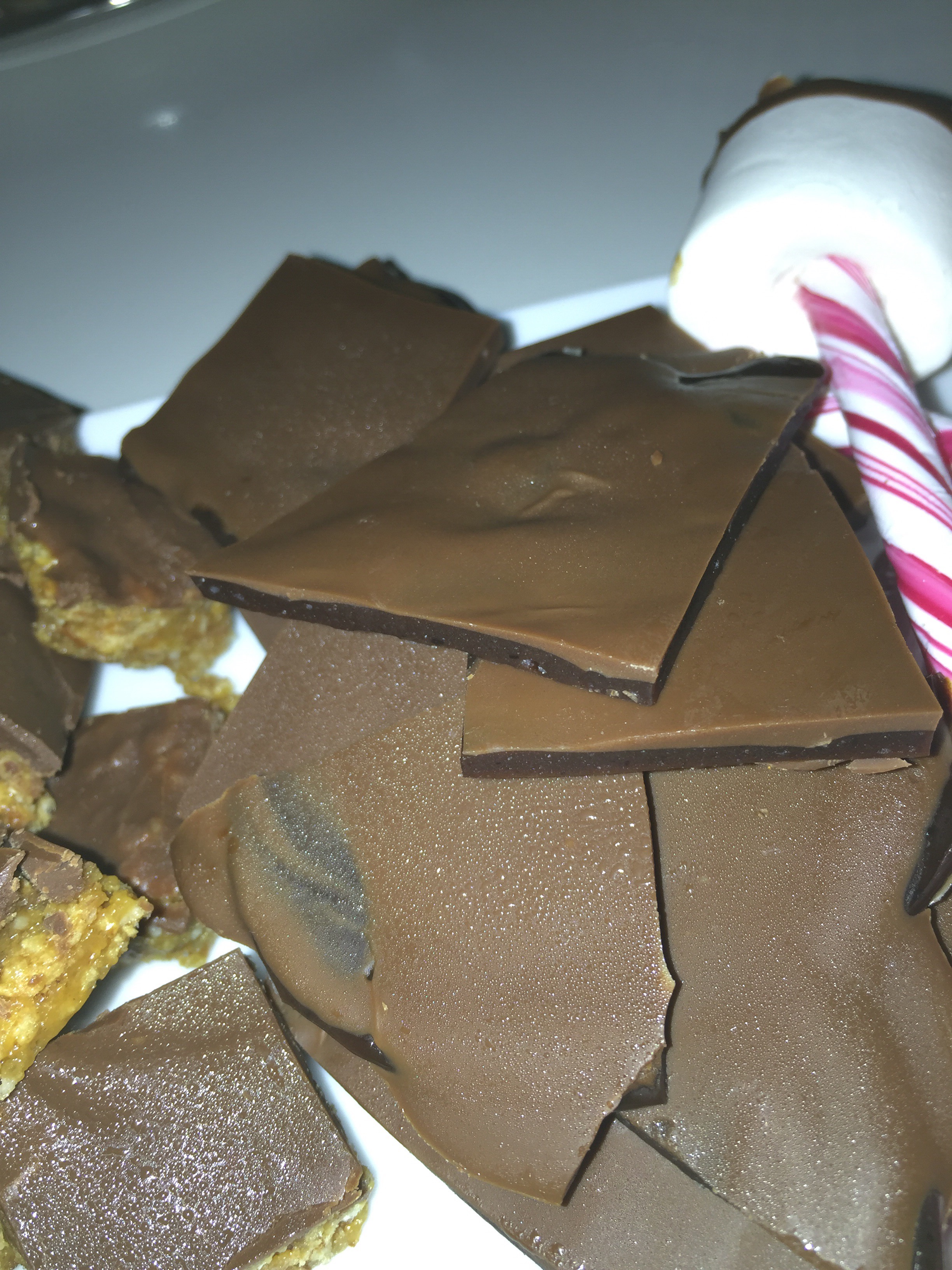 Häll ut på en plåt. Ha på smält choklad direkt och förvara kallt. I frysen eller ute.