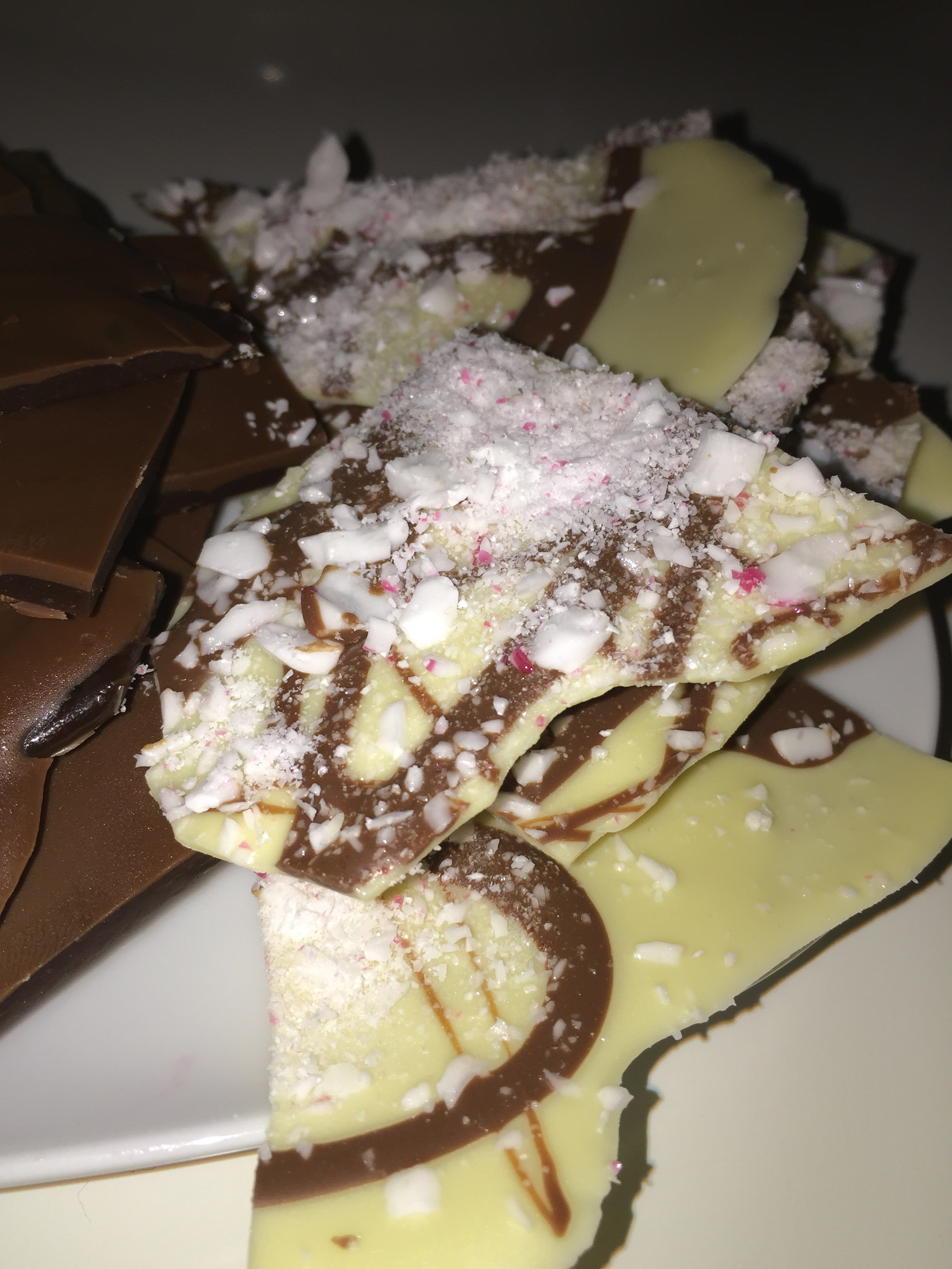 Smält chokladen och bred den vita chokladen på ett bakplåtspapper. Ringla över den ljusa chokladen och strö på krossad polkagris.