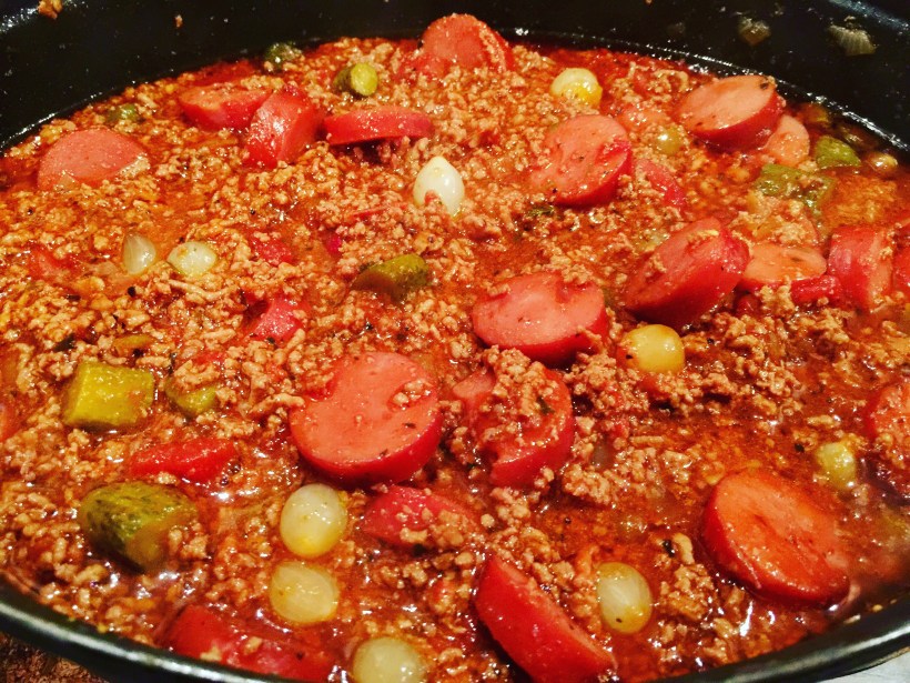 Skär korven i skivor. Skala och hacka löken. Skala och hacka vitlöken. Stek korven och löken i smör i en stekpanna. Lägg över det i en gryta och stek köttfärsen så att den blir smulig. Lägg över färsen i grytan och tillsätt övriga ingredienser och smaka av.