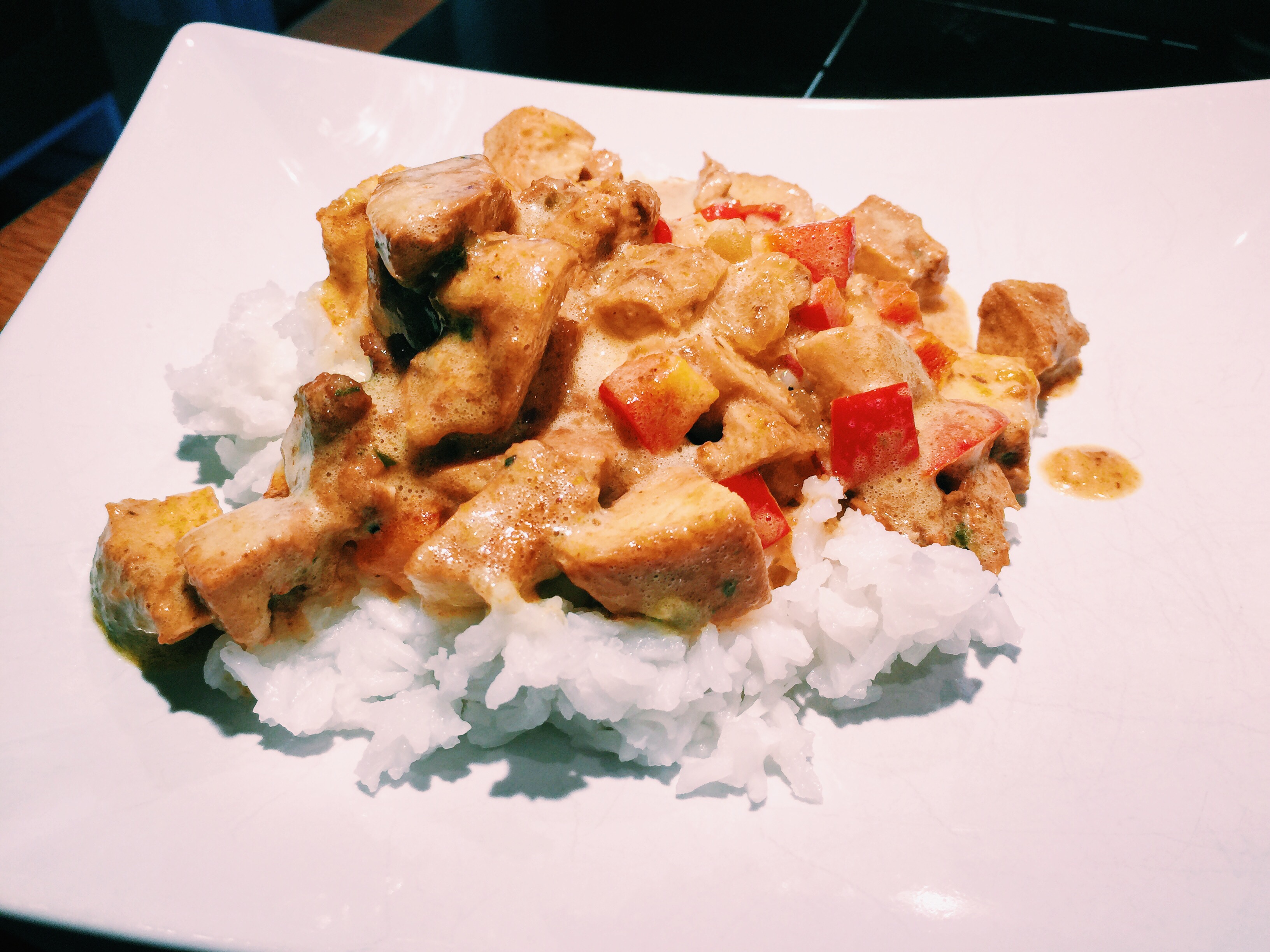 Mal/mixa mandeln smått och häll ner den. Tillsätt grädde, yoghurt och kokosmjölk. Smula ner buljongtärningen, tillsätt citronsaft och socker. Lägg i kycklingbitarna. Låt koka minst 1 timma (på medelvärme) så köttet blir mört och gött!! Smaka av med mer salt och socker, och späd med mer kokosmjölk, grädde eller vatten om det blir för tjockt.