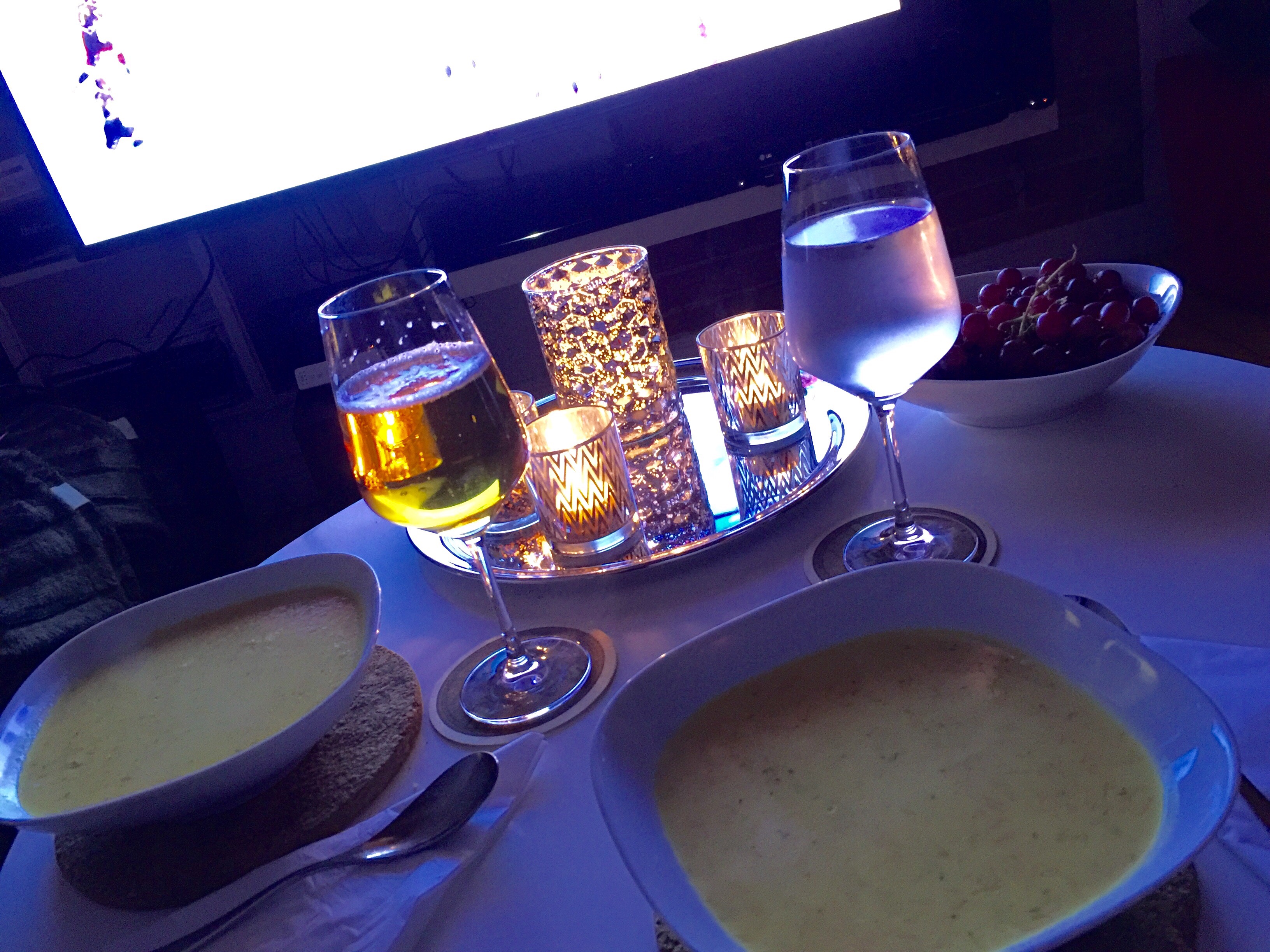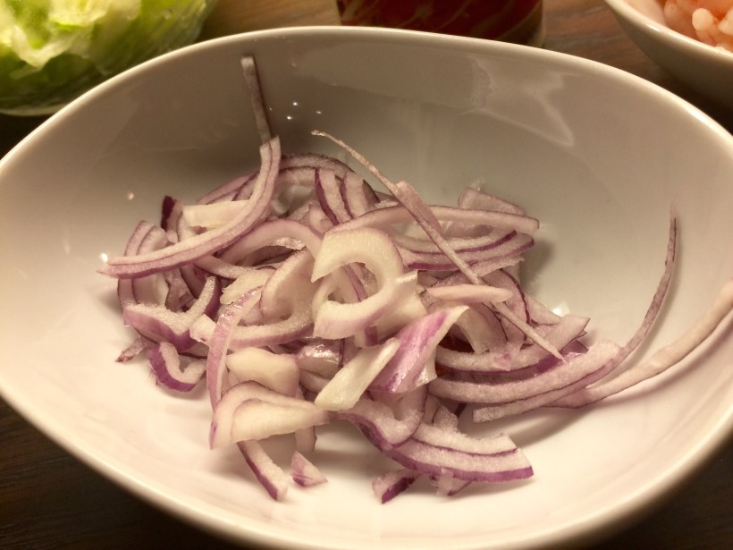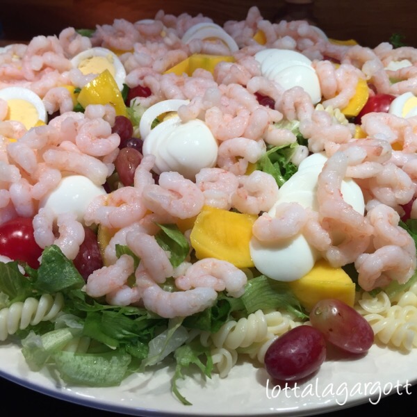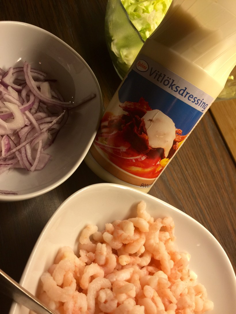 Smaka av med salt & peppar och låt puttra en liten stund. Häll i räkorna och låt dem bli varma.