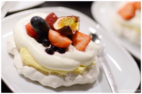 Efterrätt/Dessert: Riskripsies-pavlova med vaniljsmörkräm och färska bär