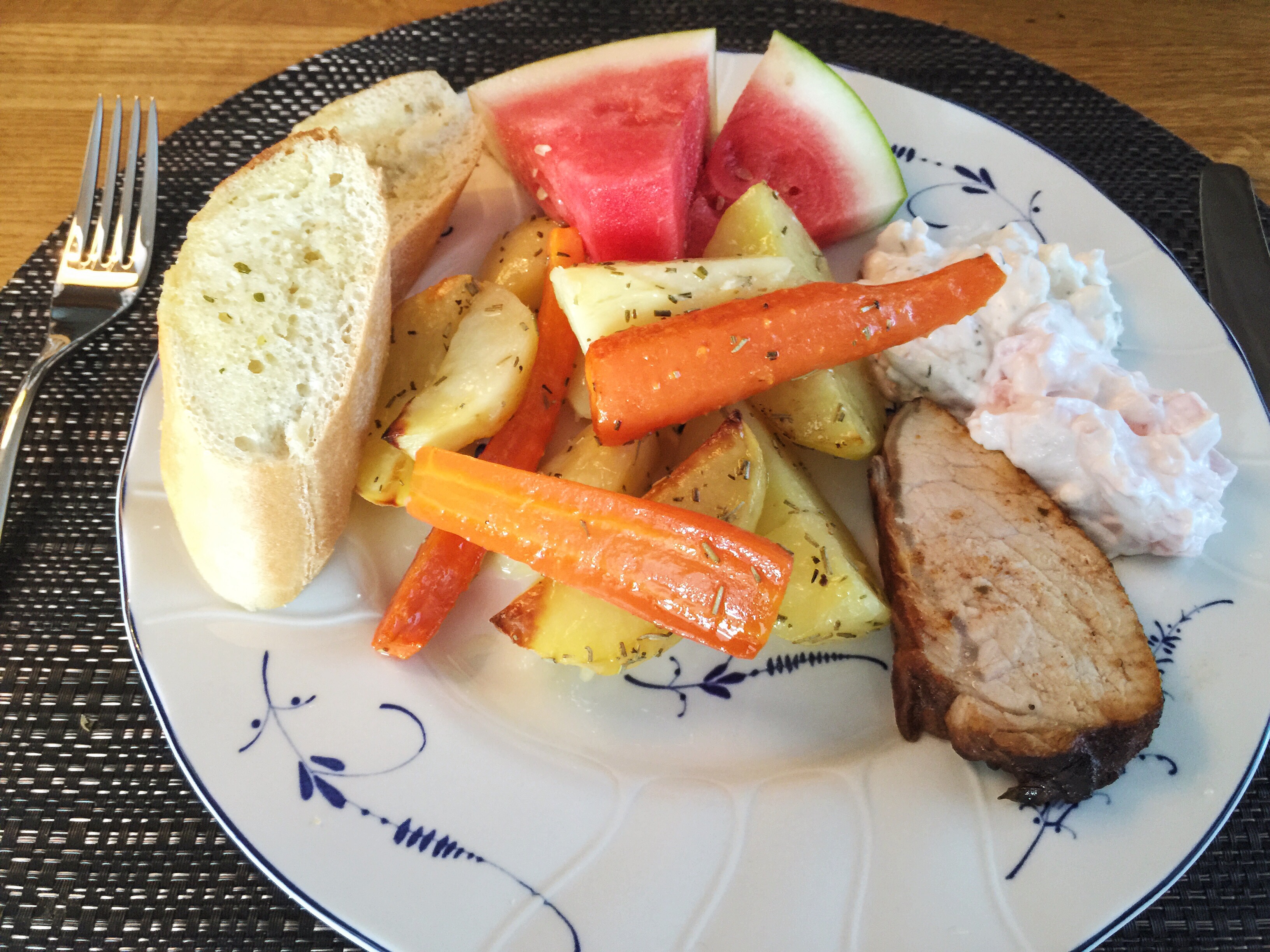Vi grillade färdigmarinerad fläskytterfilé, rotfruktsgratäng & coloslaw.